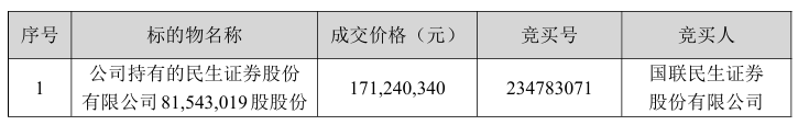11月12日晚间,国联民生证券公告称,当日公司通过司法拍卖竞得泛海控股持有的民生证券8154.3019万股股份(占民生证券总股本的0.72%),成交价格为1.71亿元,并已收到《成交确认书》。