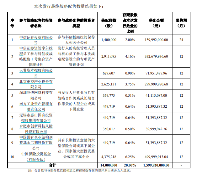 记者注意到,中信证券作为保荐机构,跟投了140万股,占比2%,跟投金额1.6亿元。跟投股份锁定期两年。