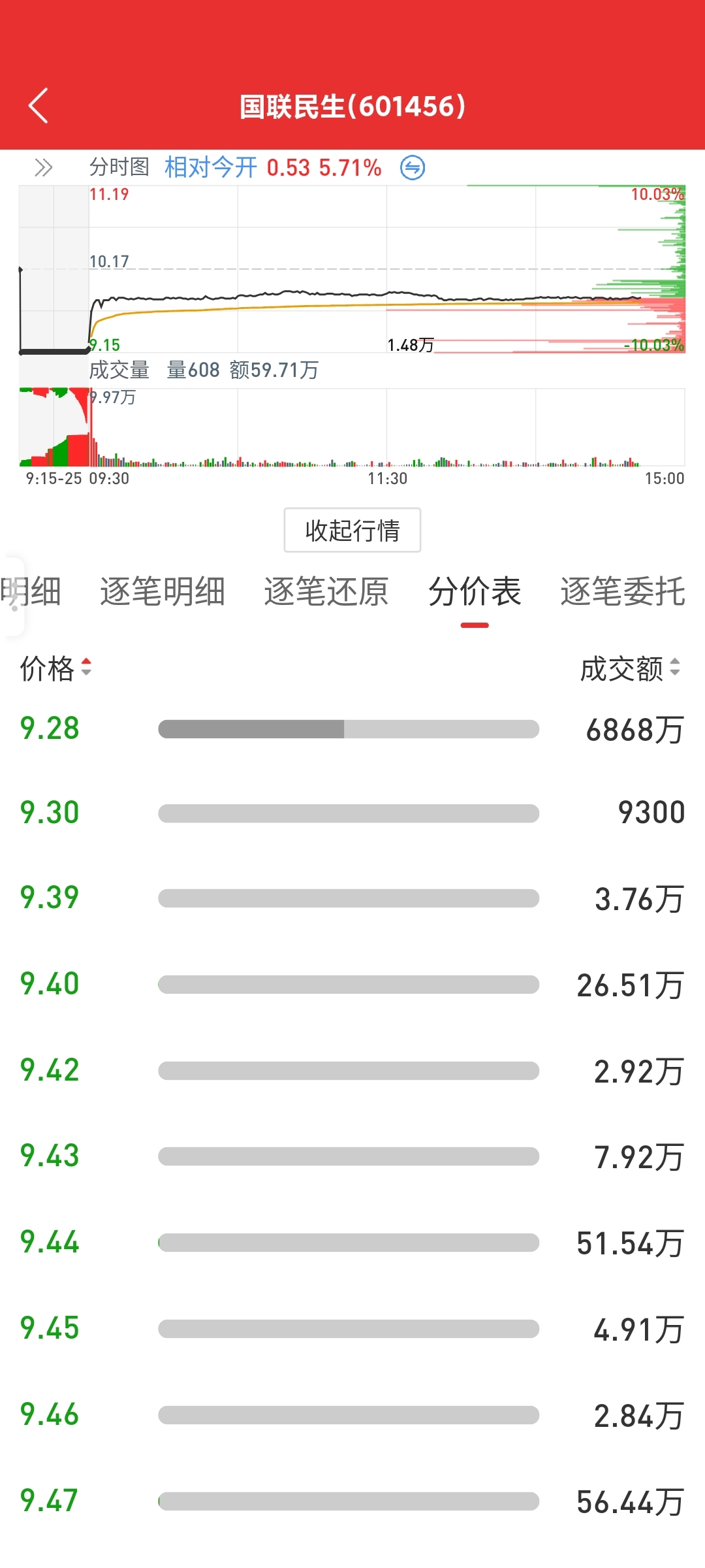 $国联民生(SH601456)$ 9.28应该是铁底了,今天竞价没有买的,9.5以下买到的不到500万