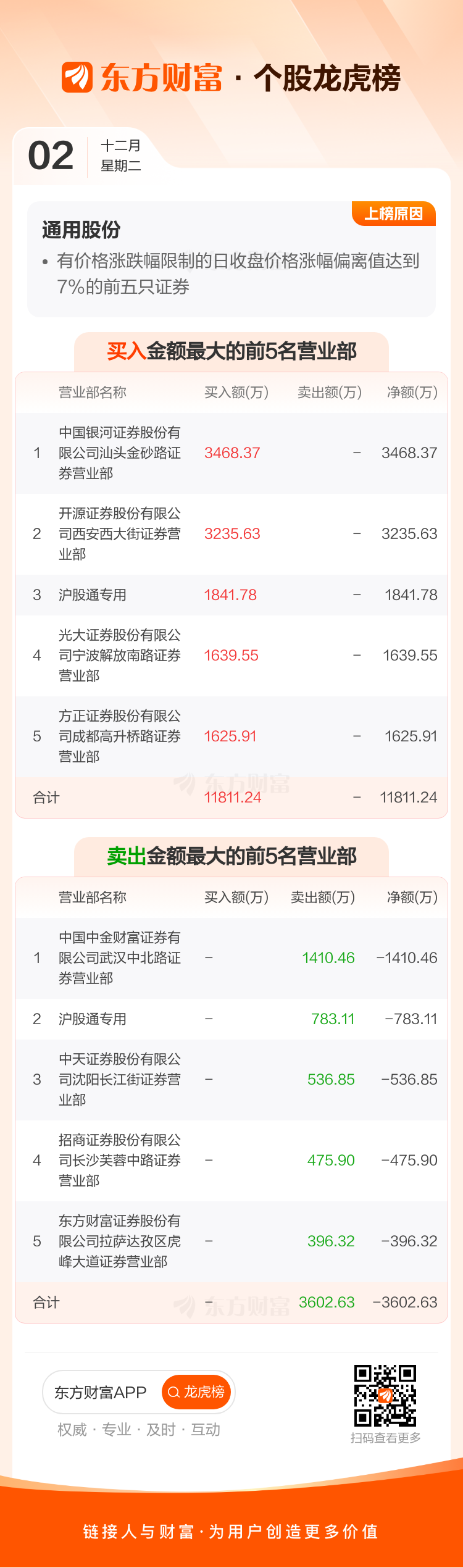 交易所2025年12月2日公布的交易公开信息显示,通用股份因成为有价格涨跌幅限制的日收盘价格涨幅偏离值达到7%的前五只证券上榜。通用股份当日收报4.69元,涨跌幅10.09%,偏离值10.51%,换手率6.98%,成交额5.02亿。