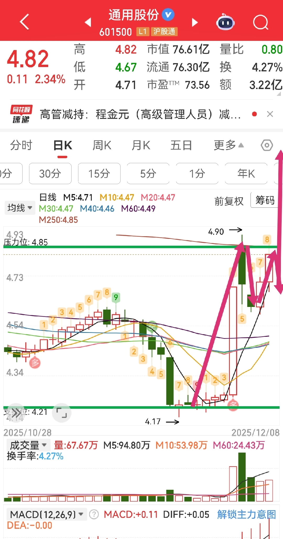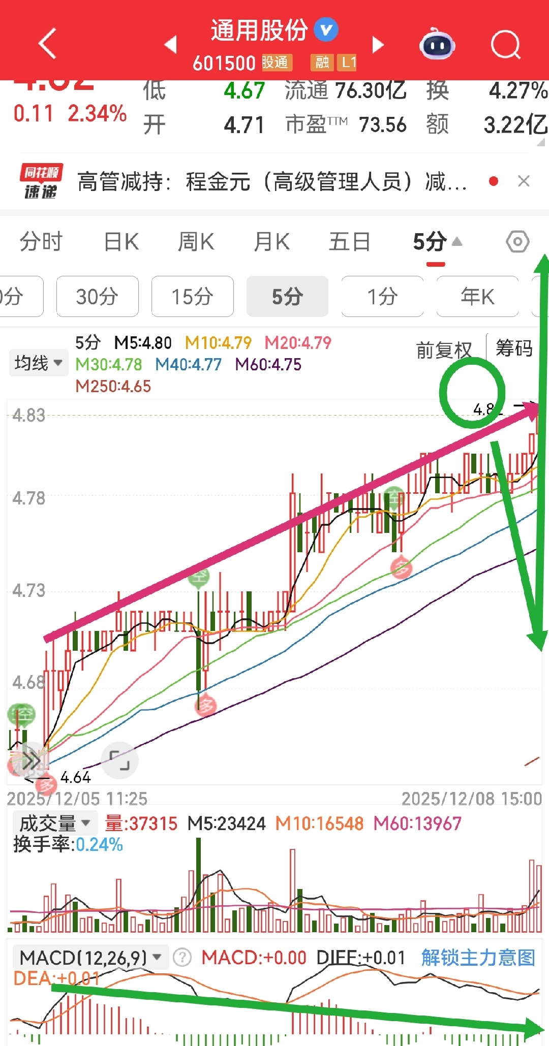 $通用股份(SH601500)$ 股价运行在智能撑压线之间,冲击压力位4.85元遇阻回落!今天的反弹并不理想,5分钟k线图,股价和macd出现上涨背离,后市对应会有5分钟级别的调整震荡,调整震荡结束还会重拾升势