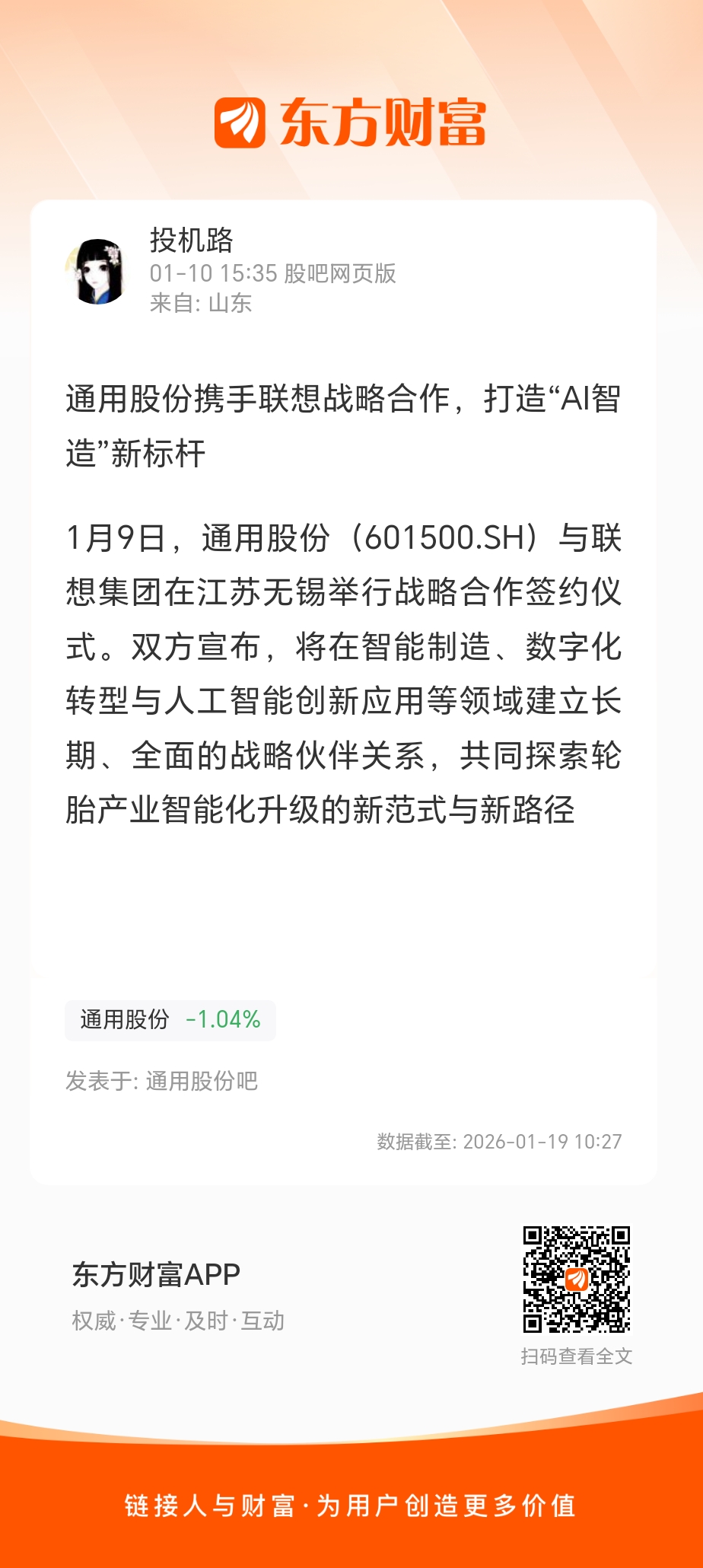 1月9日,通用股份(601500.SH)与联想集团在江苏无锡举行战略合作签约仪式。双方宣布,将在智能制造、数字化转型与人工智能创新应用等领域建立长期、全面的战略伙伴关系,共同探索轮胎产业智能化升级的新范式与新路径