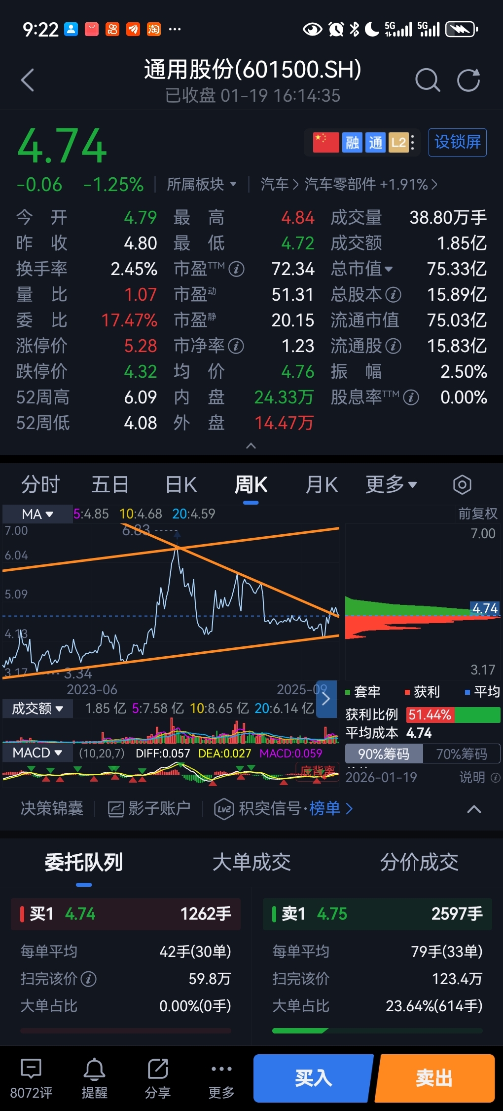 $通用股份(SH601500)$ 我补充说一句,从技术形态讲,周线突破且回踩到位了,我今天4.74进了一层仓不到,等大阳线向上确定信号再梭哈做多