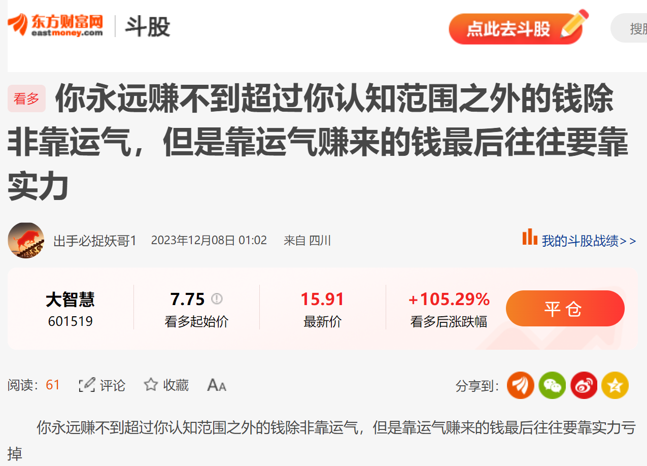 郑重声明:用户在财富号/股吧/博客等社区发表的所有信息(包括但不限于文字、视频、音频、数据及图表)仅代表个人观点,与本网站立场无关,不对您构成任何投资建议,据此操作风险自担。请勿相信代客理财、免费荐股和炒股培训等宣传内容,远离非法证券活动。请勿添加发言用户的手机号码、公众号、微博、微信及QQ等信息,谨防上当受骗!