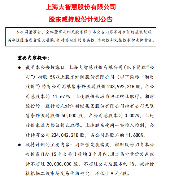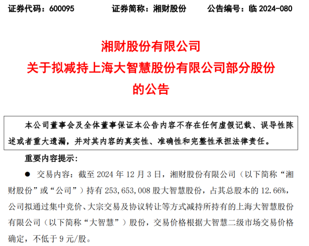 2024年12月6日,湘财股份公告称,拟择机减持所持有的大智慧股份,理由是“提高公司资产使用效率和流动性”。