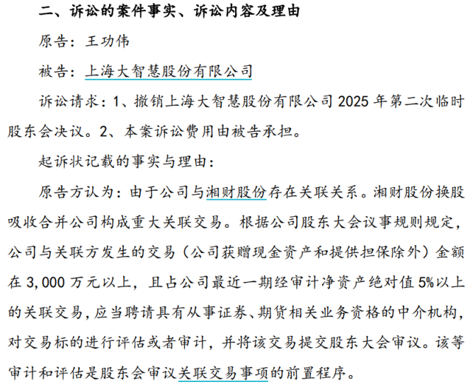 2025年10月13日,大智慧召开临时股东大会,高票通过了与湘财股份换股吸收合并的相关议案。但仅仅两天后,原告王功伟就向上海市浦东新区人民法院提起诉讼,主张撤销这次股东会决议。