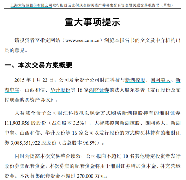 今年3月17日,两家公司同步公告筹划重组,湘财股份拟通过换股方式吸收合并大智慧,并配套募资不超过80亿元。