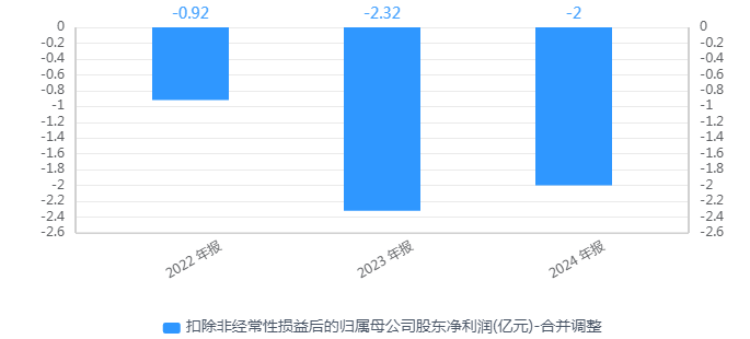 拉长时间轴线,公司扣非净利润已连续三年为负。2022年至2024年,公司扣非净利润分别为-9187.77万元、-2.32亿元、-2.00亿元。