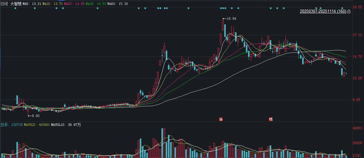 二级市场上,截至11月14日收盘,大智慧下跌1.63%报12.70元/股,总市值约252.62亿元,今年来公司股价累计上涨约37%。