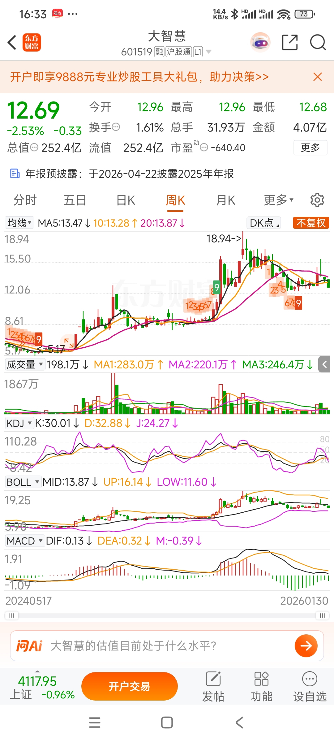 $大智慧(SH601519)$ 看看周K线,还在高位哦,需要调整到8.9---9.10,附近,才会止跌,再启升势,且等着吧!
