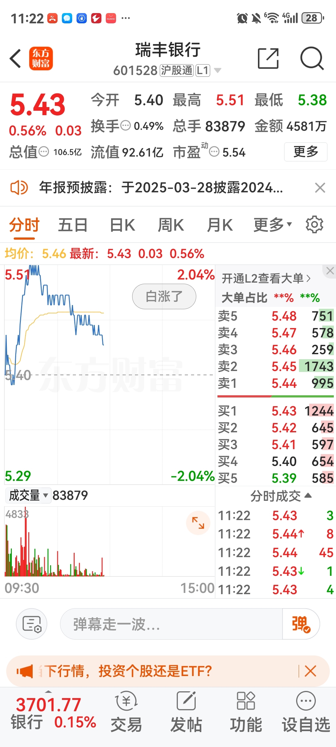$瑞丰银行(SH601528)$ 拉高出货吗散户门追进去了没