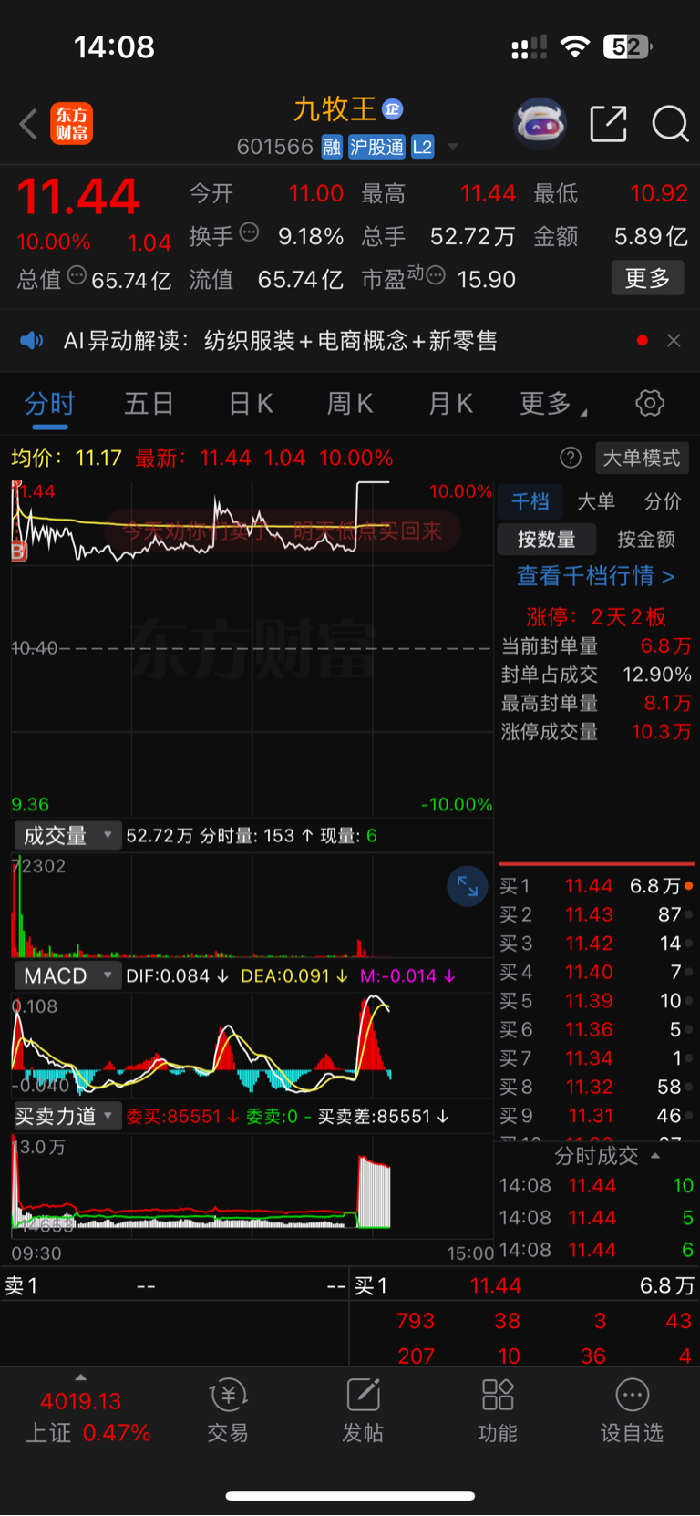 $九牧王(SH601566)$ 昨晚抖音说今天会封板,今早我早早就来了,抖音不骗人