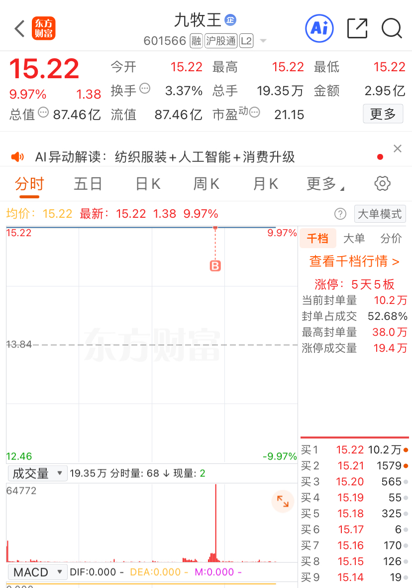 $九牧王(SH601566)$ 一觉醒来排进去了