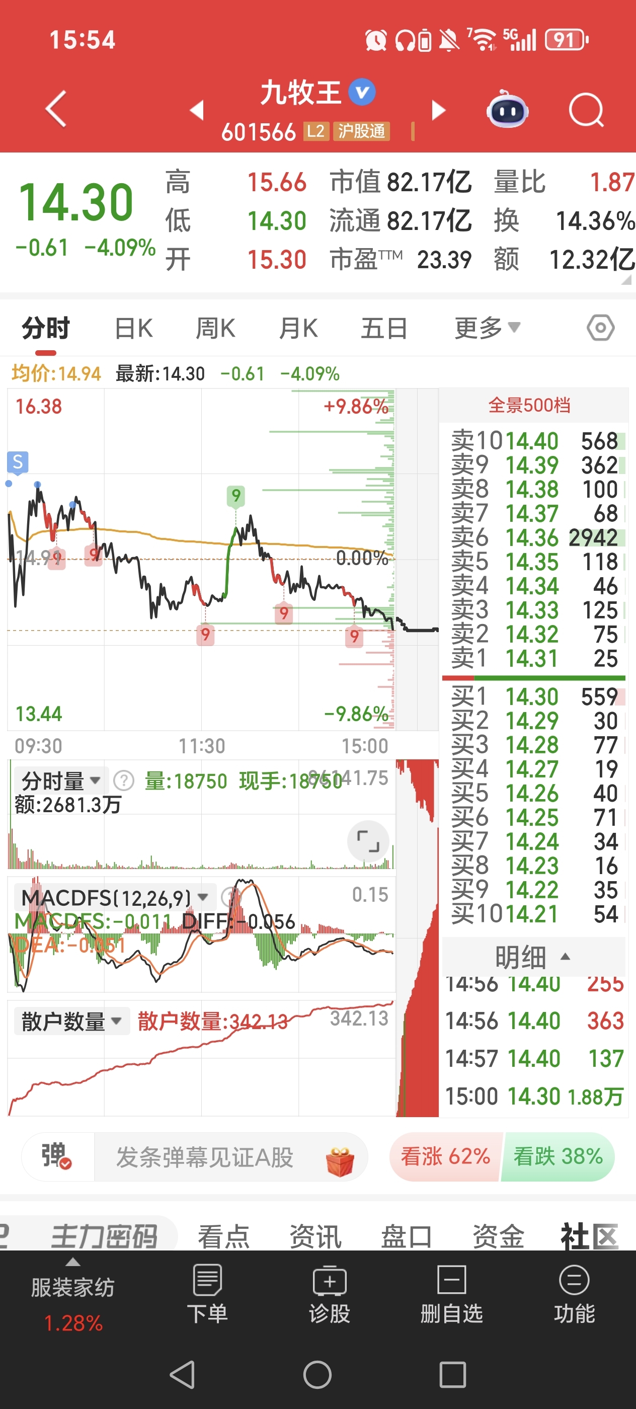 $九牧王(SH601566)$ 今天柚子至少跑了两个,其实今天的早盘很明显是拉高出货了,我也发帖说了水上不要去追,不知道几个人听的。这里感觉不会直接下去,还得震荡出货,明天再看吧。昨天尾盘竞价买的,今天清了,会继续跟踪