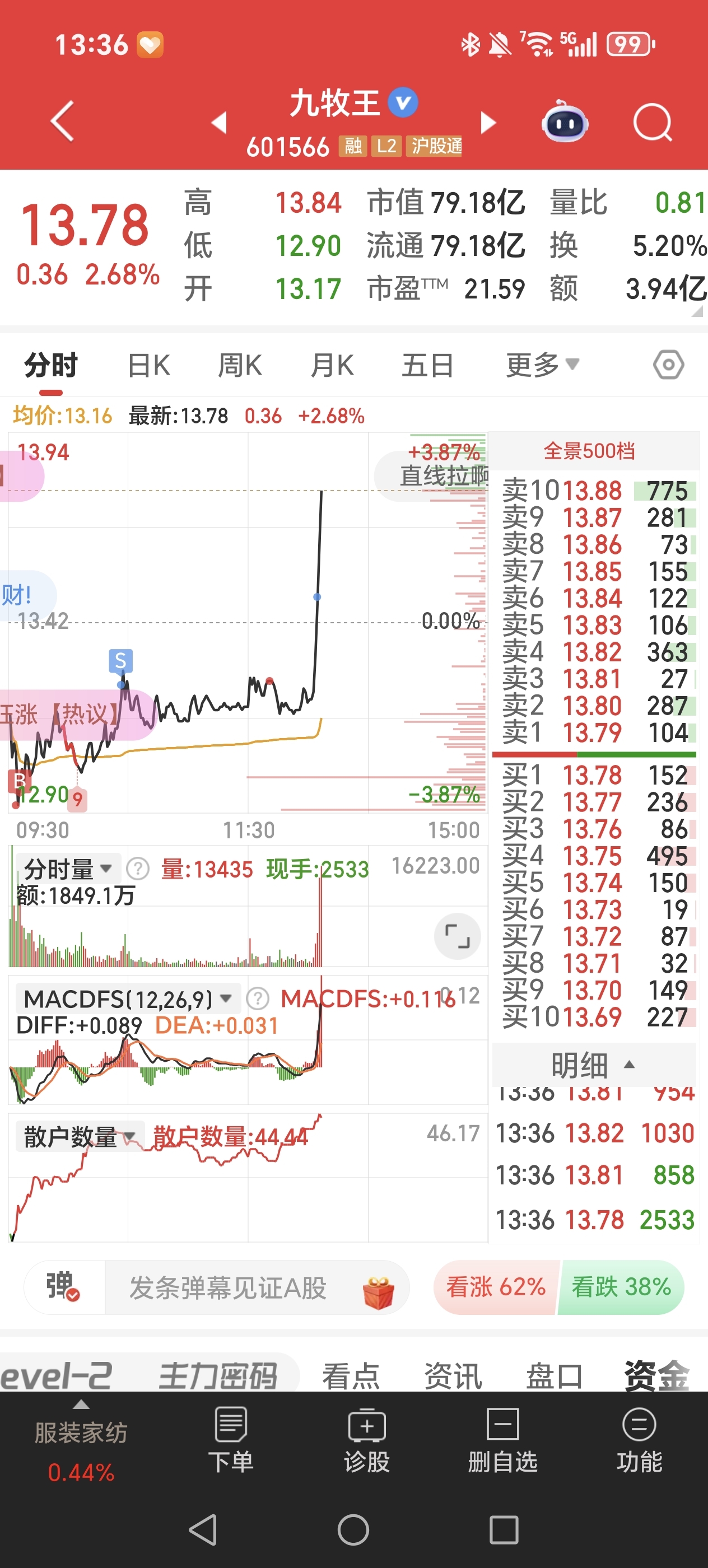 $九牧王(SH601566)$ 呵呵t飞了,早盘最低点补的,拉高卖了,但是感觉下午会涨又加仓补进去些,今天就这样吧,没仓位高位卖出了,图片总是传不上去今天