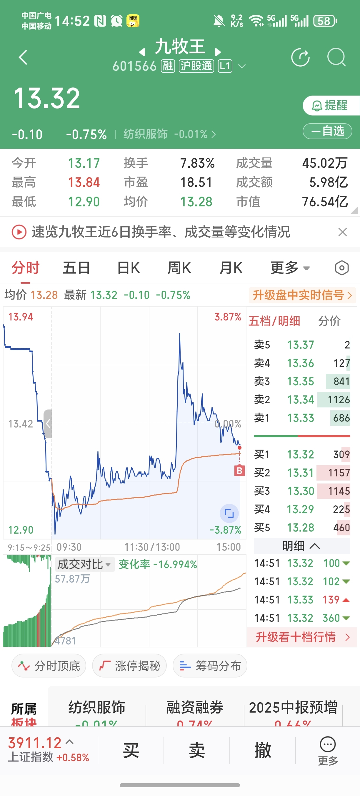 $九牧王(SH601566)$ 被套了就只能补仓了,唉,15的本啥时候能回来也不知道,孩子等着喝奶粉