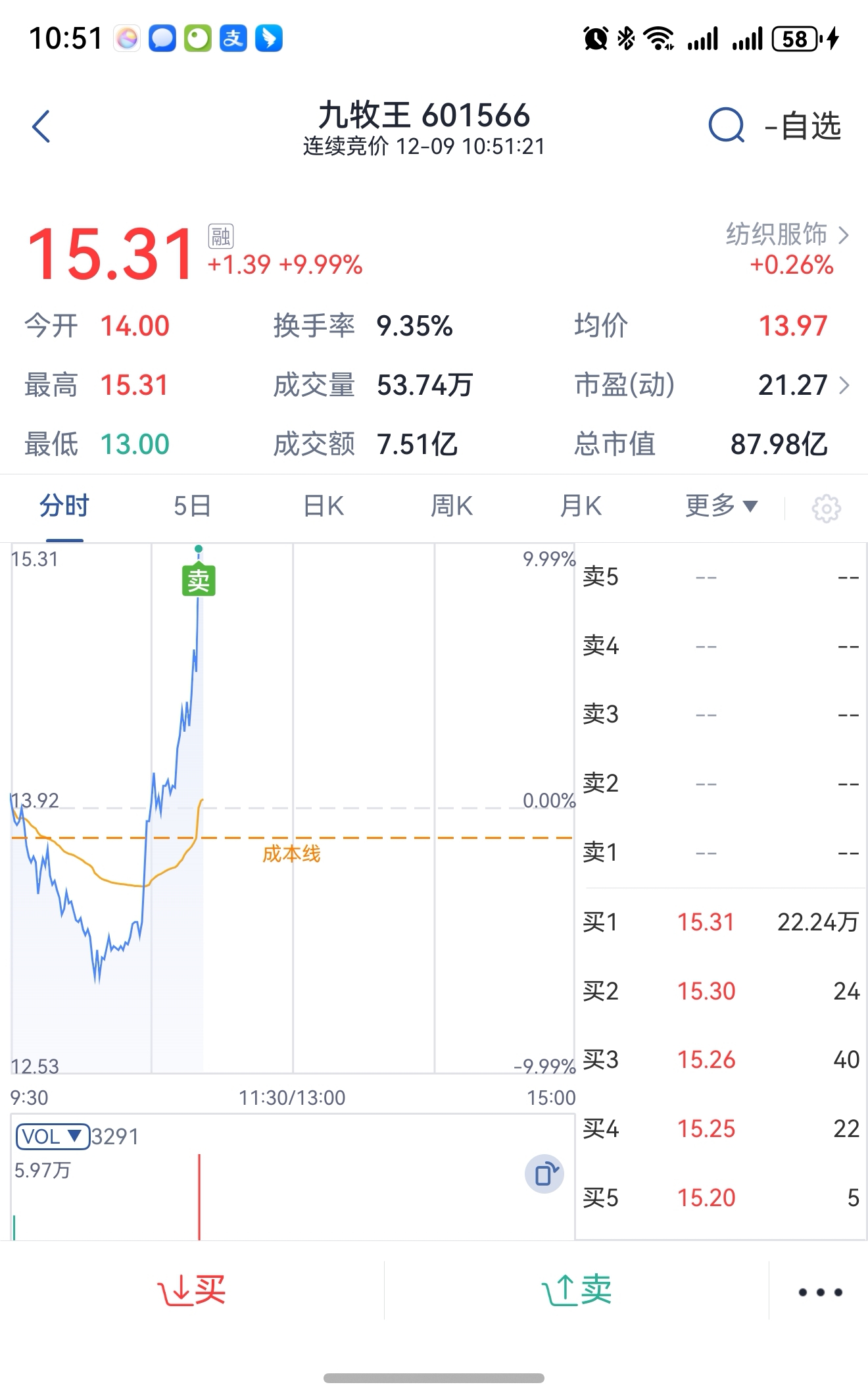 $九牧王(SH601566)$ 感谢,昨天入的今天出