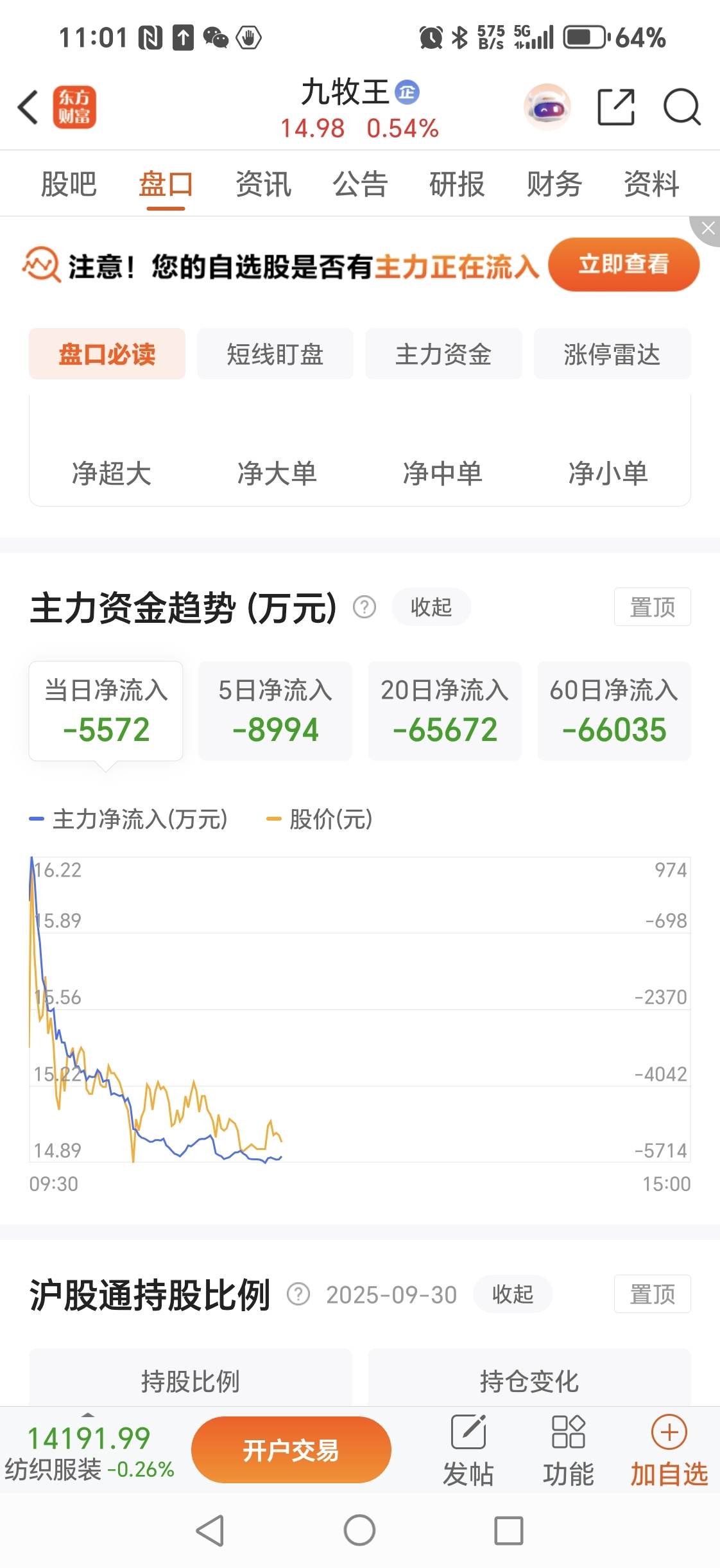 $九牧王(SH601566)$ 主力资金一直在流出,下午看会不会回流,今天高点进晕死了