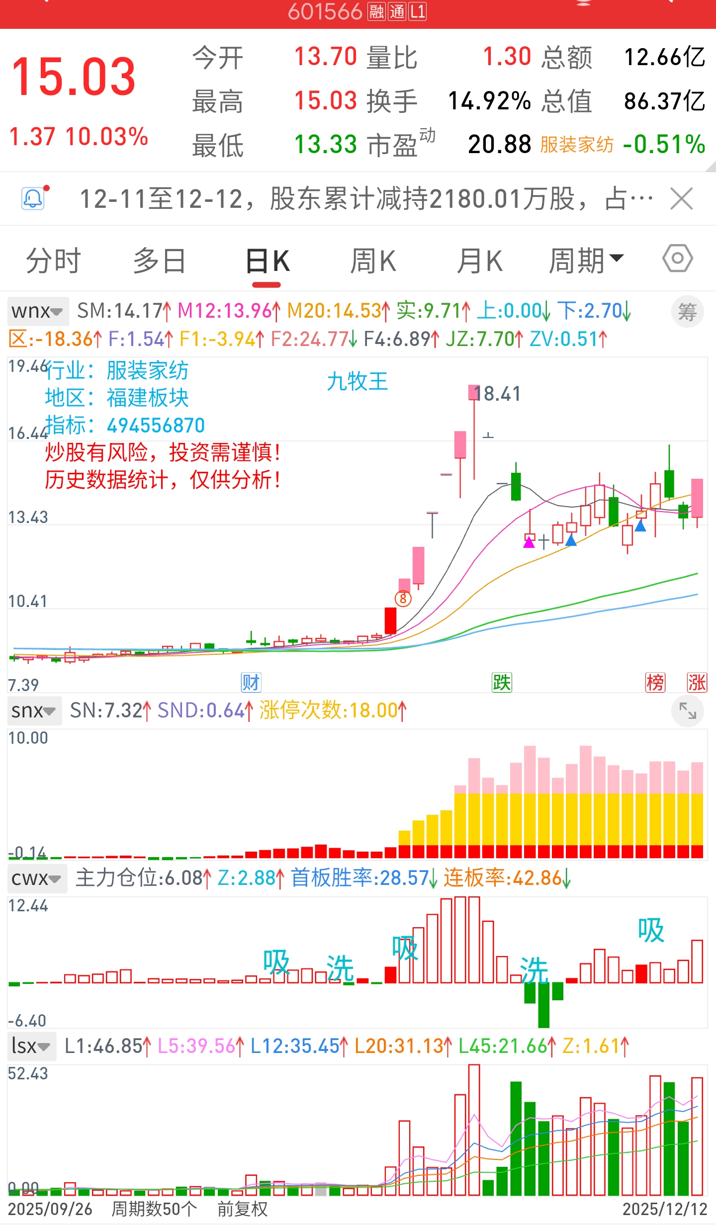 $九牧王(SH601566)$ #复盘记录# #强势机会# #股市怎么看# #实盘记录# #收盘点评# 涨停突破M20 ,相当强势。指标上sn持续水上高位,势能十足。cw显示前期吸筹时间足够长,主力筹码多,仓位重。ls持续良好。