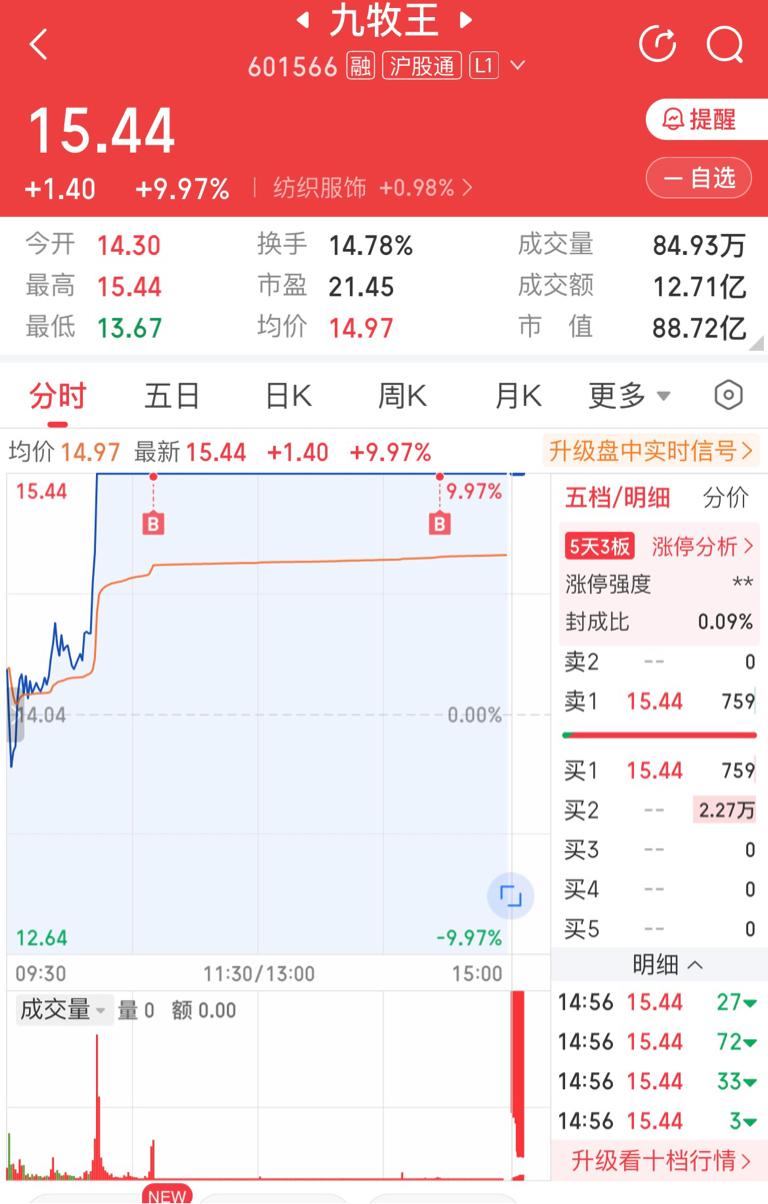 $九牧王(SH601566)$ 昨天我说了,昨天的涨停节点跟以往不一致,还好昨天两次加单排上了
