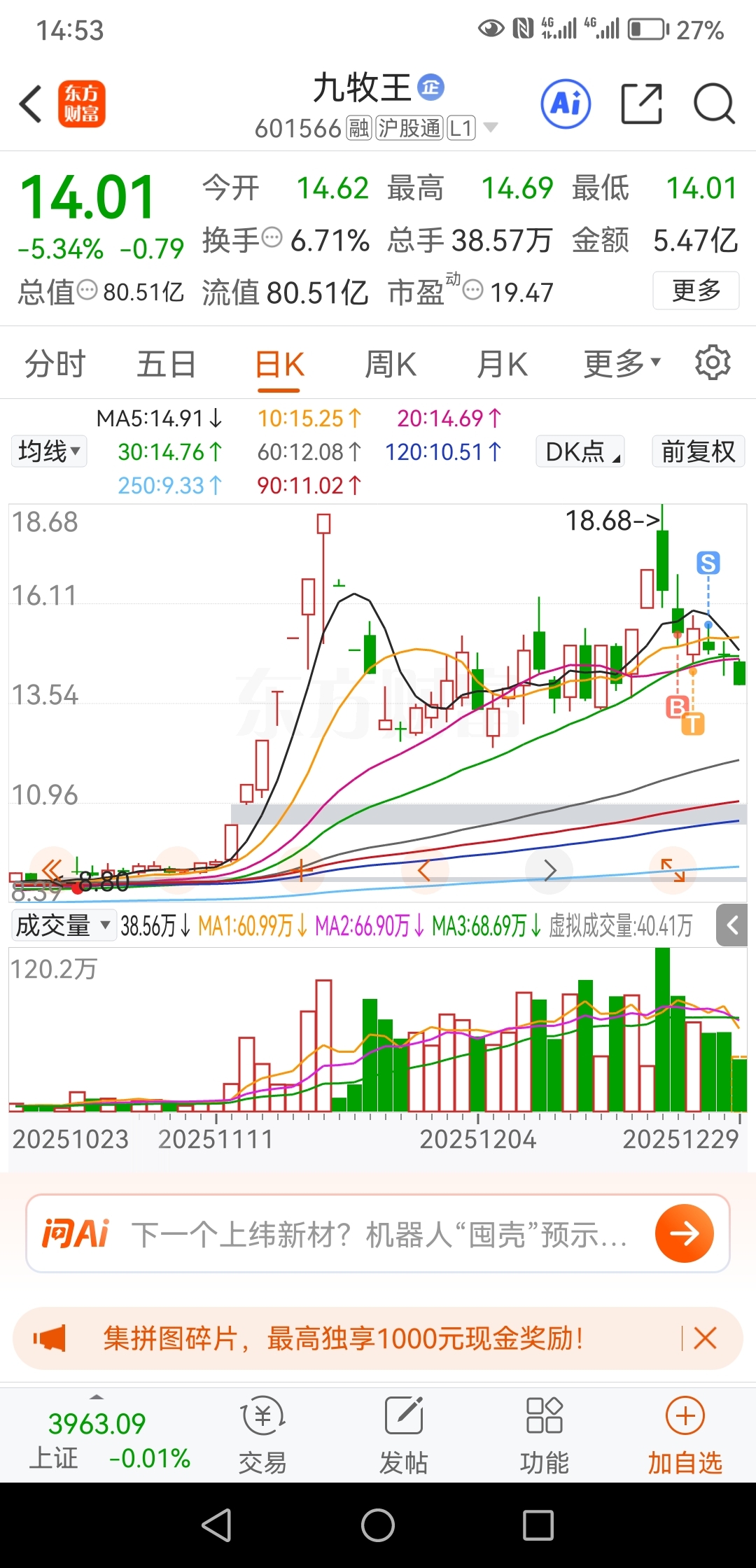 $九牧王(SH601566)$ 还好,前几天割了,回头看看,又少亏10个点