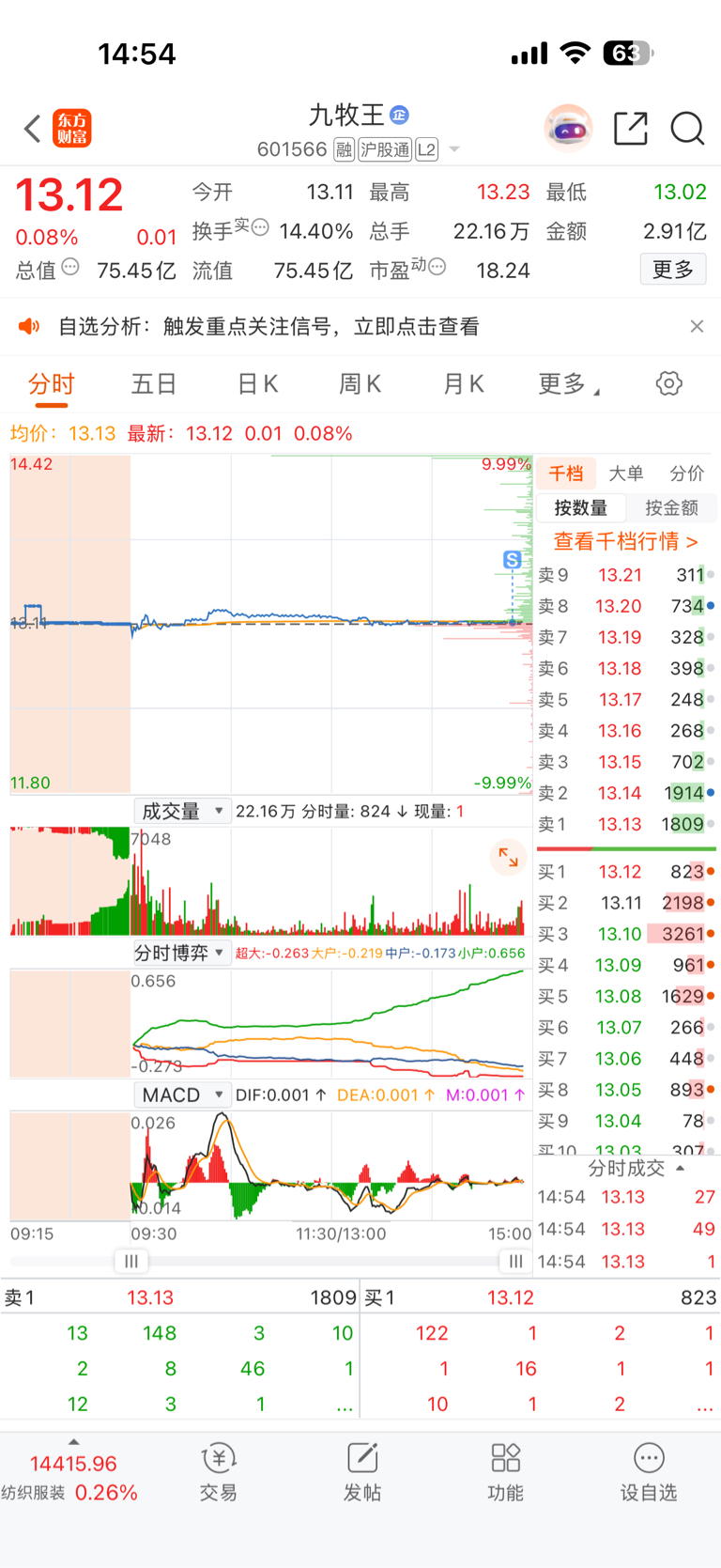 $九牧王(SH601566)$ 撤了,周五建仓前没逛下股吧,没看到股吧有愚蠢的人瞎猫碰上死耗子对了一次后教别人炒股,还精确到收盘几分几分,看到了绝对不会碰。浪费了一天行情。