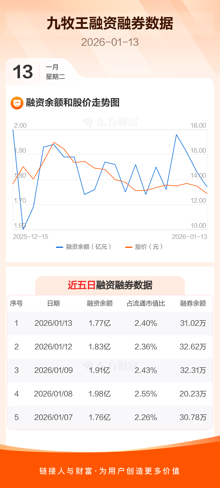 交易所最新数据显示,九牧王于2026年1月13日获融资买入4109.70万元,融资偿还4638.81万元,当日融资净偿还529.11万元。目前,该股融资余额1.77亿,占流通市值比例为2.40%。