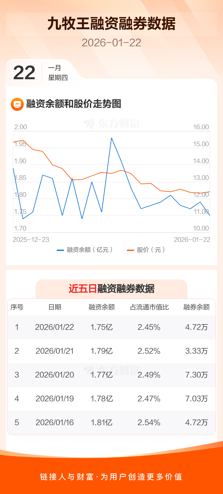 交易所最新数据显示,九牧王于2026年1月22日获融资买入994.25万元,融资偿还1384.92万元,当日融资净偿还390.67万元。目前,该股融资余额1.75亿,占流通市值比例为2.45%。