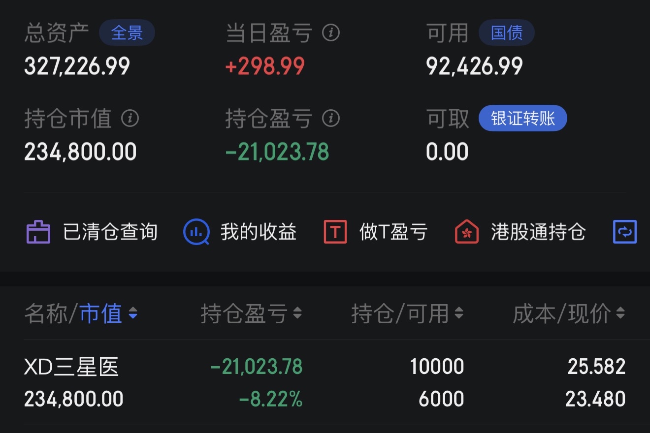 $XD三星医(SH601567)$ 回本之路第一天,今天减仓了3900股,成本上去了几毛,做T也没做好,浮盈298,离回本还有21024,量化庄股真恶心