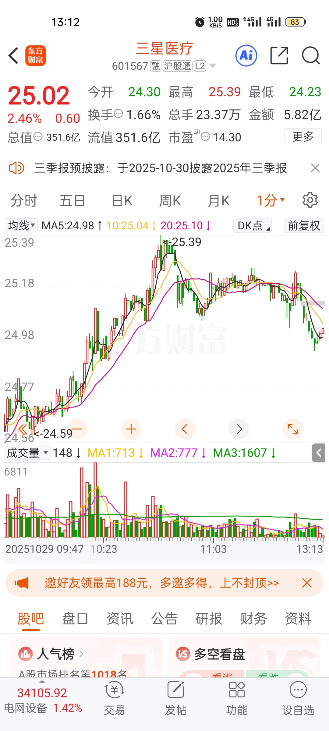 $三星医疗(SH601567)$ 上午应该出掉的,量价背离,价涨量缩