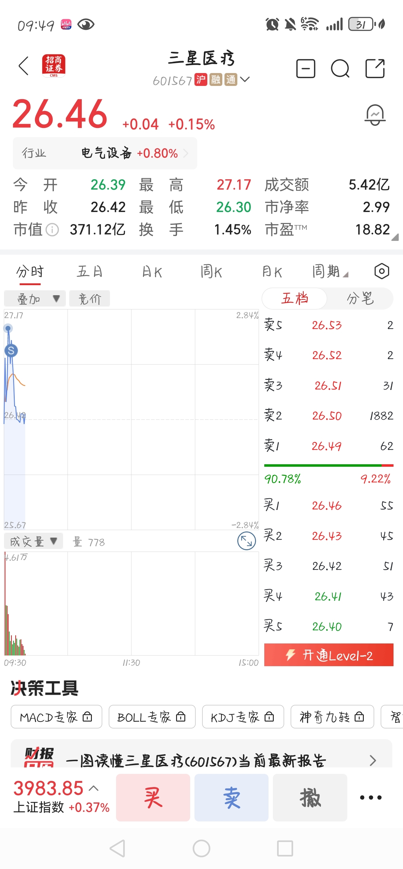 $三星医疗(SH601567)$ 不贪,挂单26.99,全出#炒股日记#