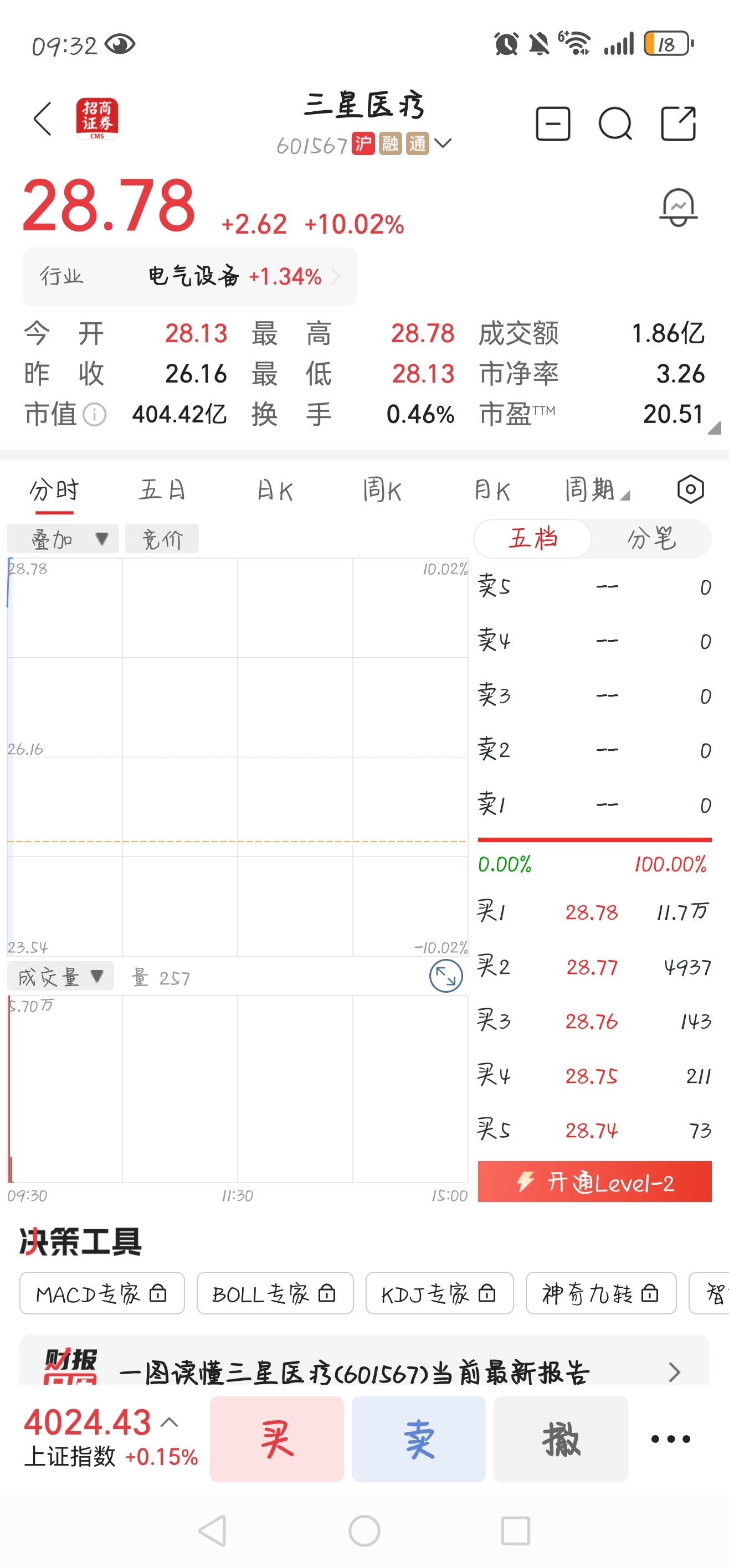 $三星医疗(SH601567)$ 在股市,要多一分耐心,昨天跌4个点,别人大消费猛赚,我一点不眼红,保持不动,今天吃大肉#炒股日记#