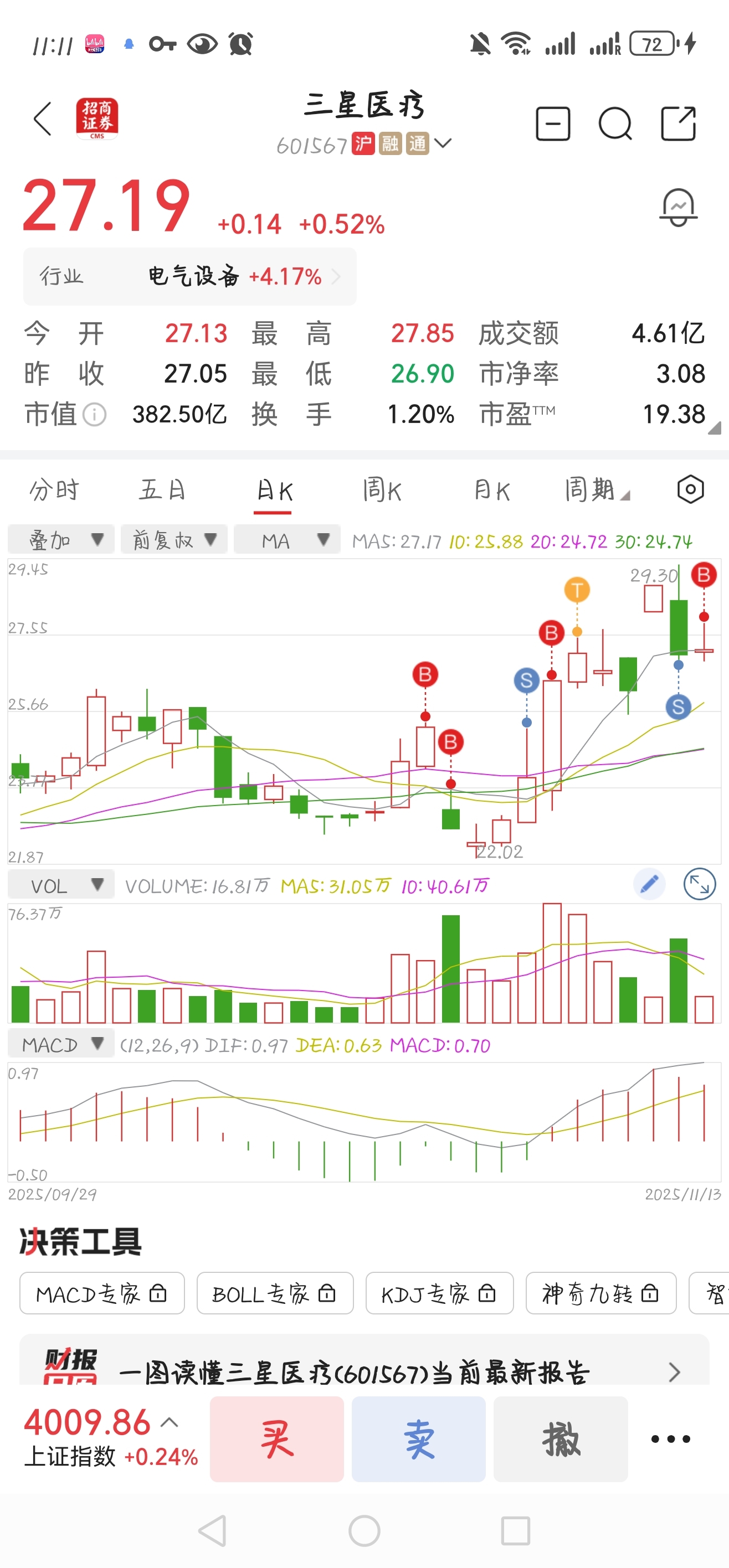 $三星医疗(SH601567)$ 昨天28.90出完,27.25继续买一点回来,光伏板块今天这么猛,等个补涨#炒股日记#