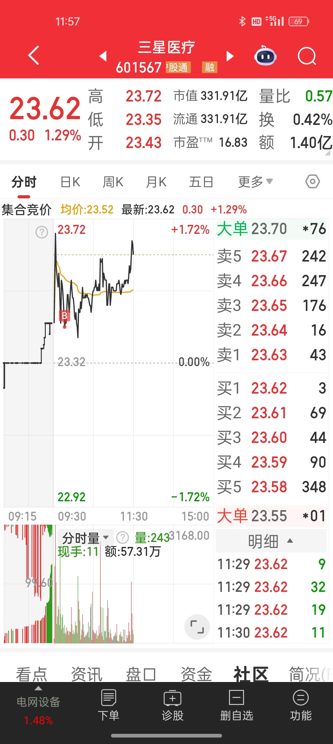 $三星医疗(SH601567)$ 鄙人不才,今日买入,成本23.422,与君共勉。今日基操已完成,晒图如下