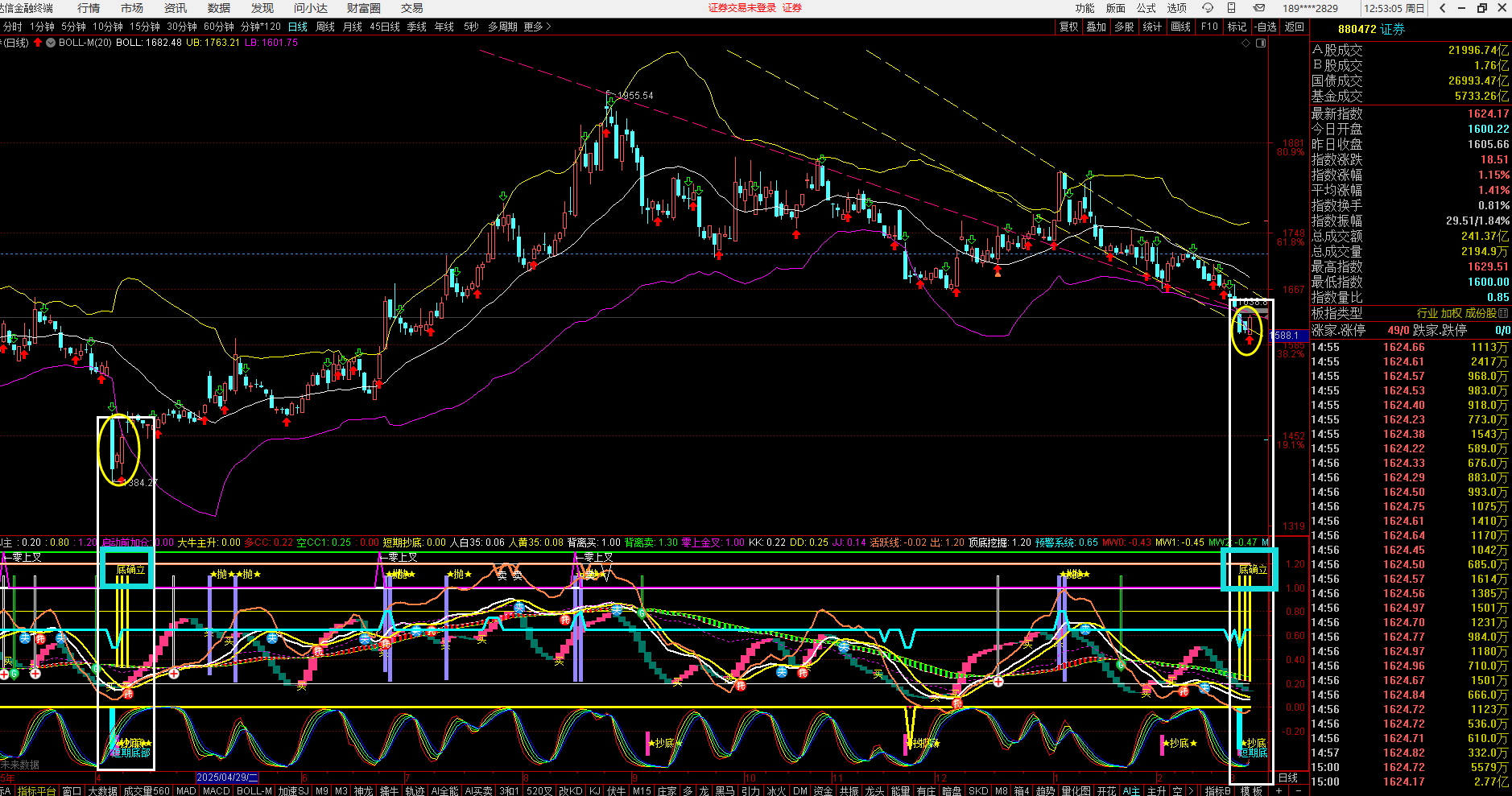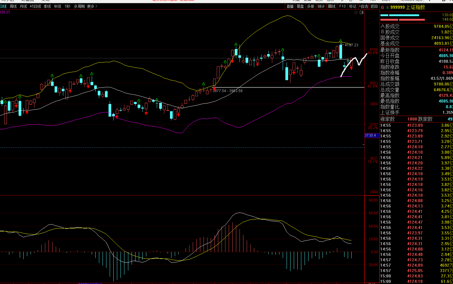 首先指数上从技术面来讲周五是普反低开高走,但是最终收在了5日线和20天线的左右,也就是说目前均线的压制作用但是还是很强,大家还记得上星期四的文章吗?我是不是给大家讲了如果哪天券商开始启动,券商上涨指数就会站上布林线中轨,上星期五券商是不是上涨了1.15%,刚好指数收盘就是站在布林线的中轨上方。上星期四的文章我说了指数摸了一下布林线中轨之后冲高回落,我还在文档里面给大家说了上证指数会围绕着布林线中轨进行震荡两天,上星期五是低开高走,那么明天星期一指数就还会围绕着布林线中轨进行震荡,也就是我给大家讲的4100点左右。