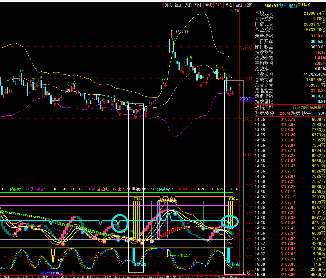券商和软件相关的科技我们来看看指数的指标,券商指数和软件服务指数现在都出现了底部的向下尖角三角形与其短期的底部,如果明天上证指数能够低开高走的话,个人认为券商以及软件服务指数会比石油天然气以及军工更有 机会,软件服务指数上星期五是有大资金在买入的,券商指数在上星期文章里面也给大家讲了3月的中下旬券商业绩会陆陆续续公布,券商业绩是非常靓丽的,券商现在的位置现在的三根K线就是类似于去年4月7号那个三根K线,底部的孕线加底部的穿头破脚完全一样。还有一个就是关注石油天然气以及电网设备还不如关注电池相关的个股。星期五布置了一个电池的个股,目前套了1%
