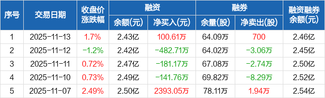 融资方面,当日融资买入1233.17万元,融资偿还1132.57万元,融资净买入100.61万元。融券方面,融券卖出900股,融券偿还200股,融券余量64.09万股,融券余额268.54万元。融资融券余额合计2.46亿元。