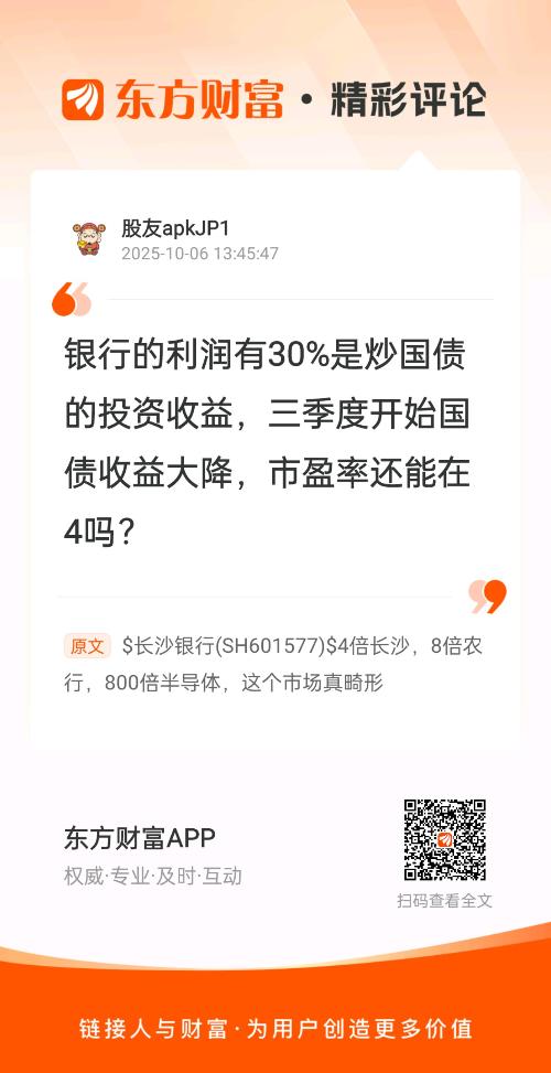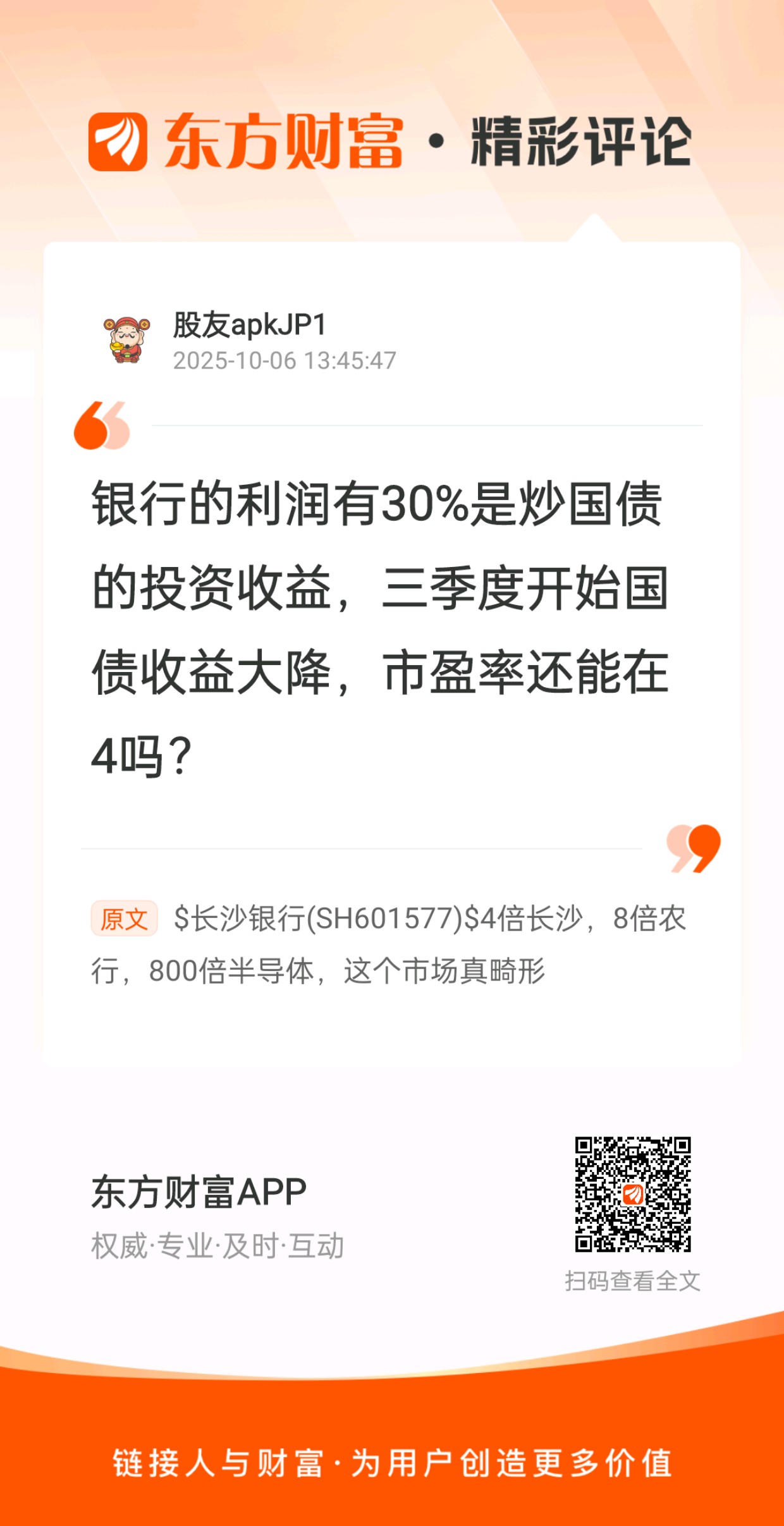 //@股友apkJP1 :银行的利润有30%是炒国债的投资收益,三季度开始国债收益大降,市盈率还能在4吗?