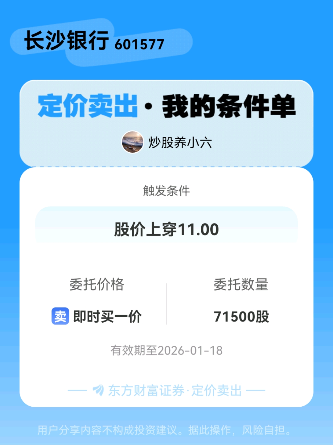 #条件单交流# #定价卖出晒单# 一位股神设置了一个定价卖出条件单,接下来就是见证奇迹的时刻~$长沙银行(SH601577)$