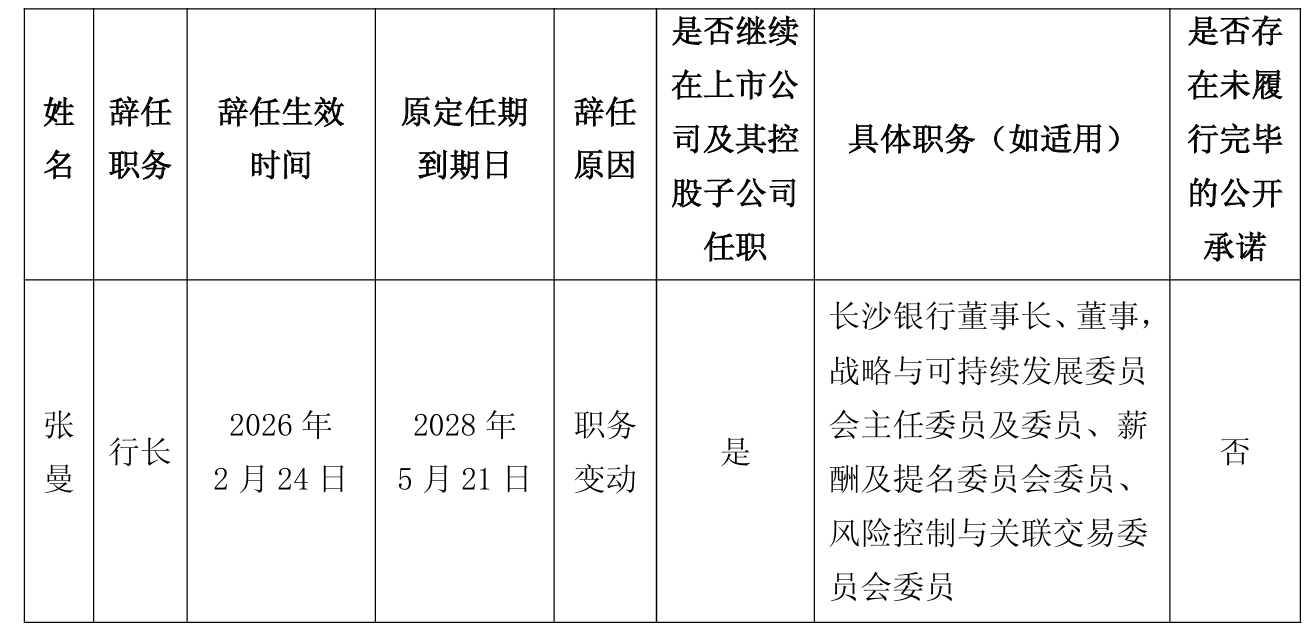 2月25日盘后,长沙银行(601577)发布公告称,张曼因职务变动申请辞去长沙银行行长职务,辞任自2026年2月24日起生效。
