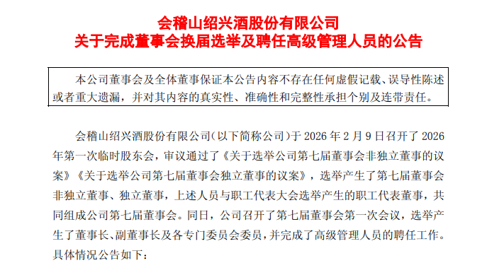 2月10日,会稽山召开第七届董事会第一次会议,选举新一届董事会和高管成员。这其中,唐桂江接替杨刚成为公司董事、总经理。