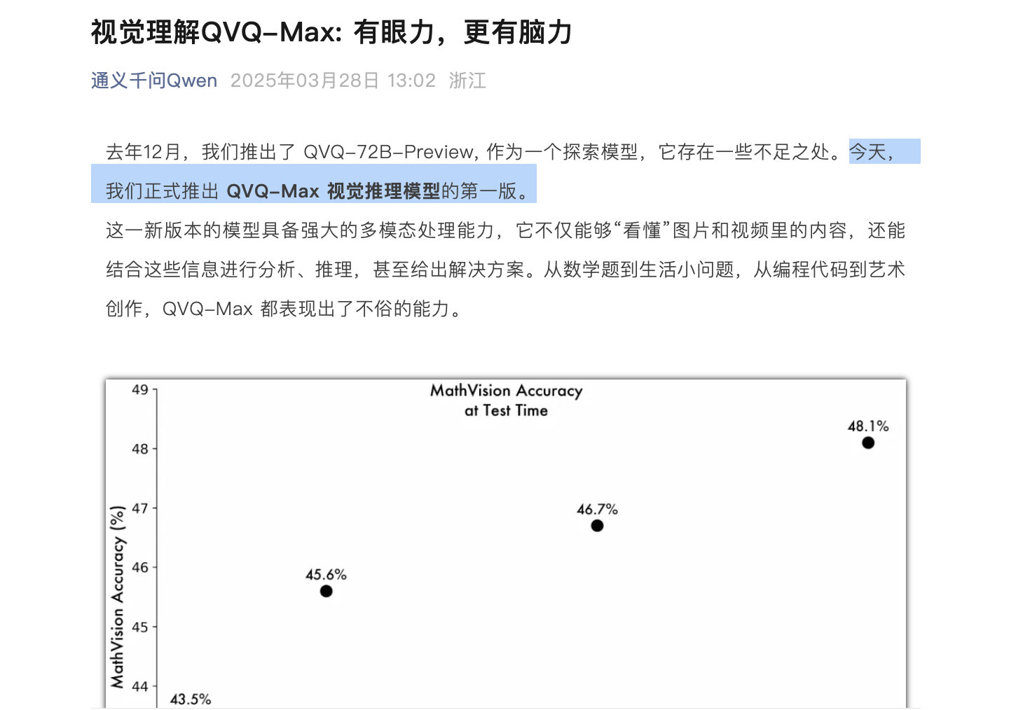 此次文化传媒板块异动与AI方面多个利好消息有关。3月28日13时左右,阿里通义千问正式推出QVQ-Max视觉推理模型第一版。据通义千问发布的消息,去年12月,阿里通义千问推出了QVQ-72B-Preview,作为一个探索模型,它存在一些不足之处。今天,通义千问正式推出QVQ-Max视觉推理模型的第一版。这一新版本的模型具备强大的多模态处理能力,它不仅能够“看懂”图片和视频里的内容,还能结合这些信息进行分析、推理,甚至给出解决方案。从数学题到生活小问题,从编程代码到艺术创作,QVQ-Max都表现出了不俗的能力。