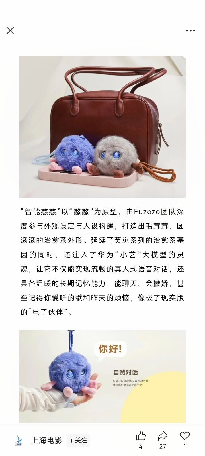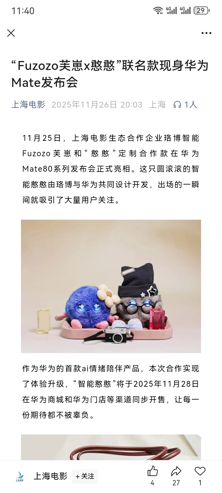 上海电影生态合作企业珞博智能Fuzozo芙崽和“憨憨”定制合作款在华为Mate80系列发布会正式亮相