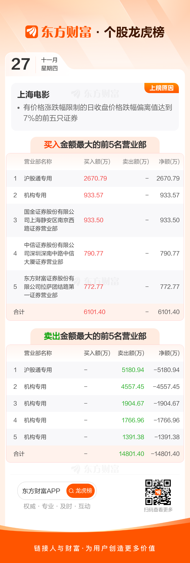上海电影(601595)龙虎榜数据(11-27)