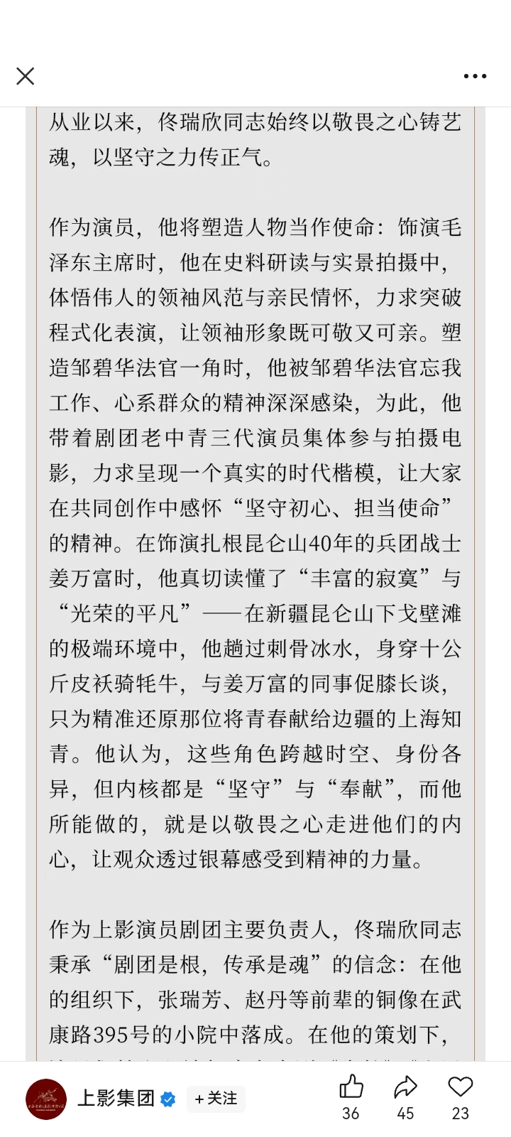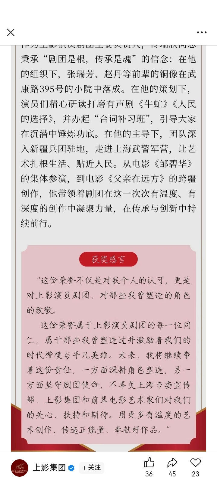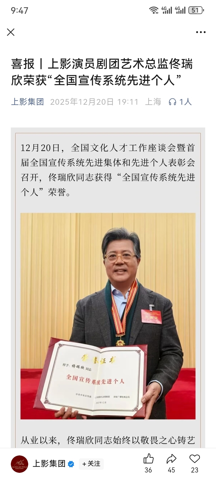 喜报|上影演员剧团艺术总监佟瑞欣荣获“全国宣传系统先进个人”