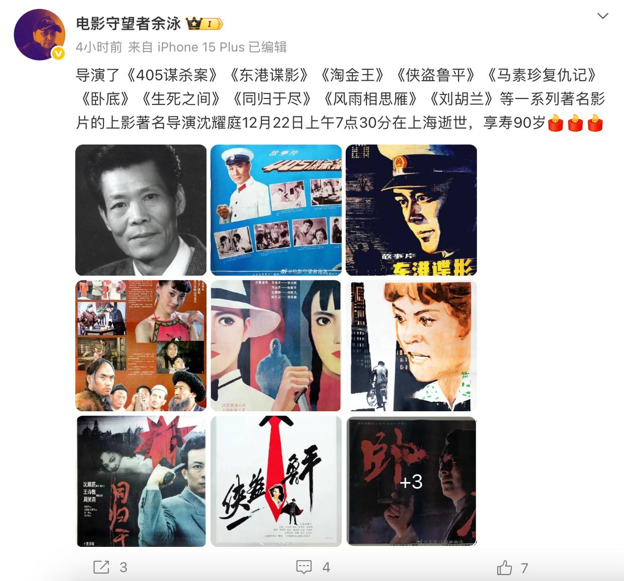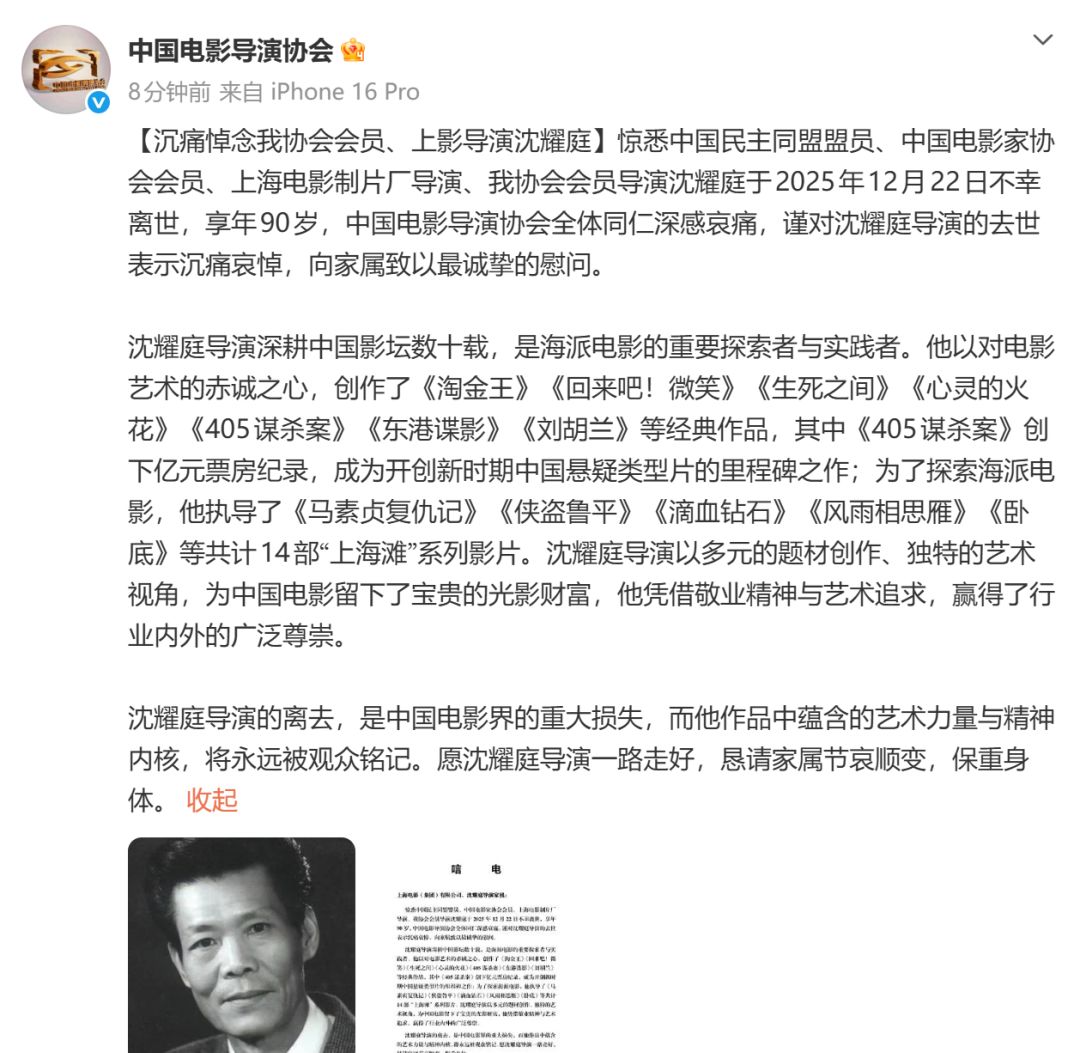 电影人江平也在朋友圈转发了上海电影(集团)有限公司退管会发布的讣告。讣告上显示,导演沈耀庭因病医治无效,于2025年12月22日7时30分在家中去世,享年90岁。