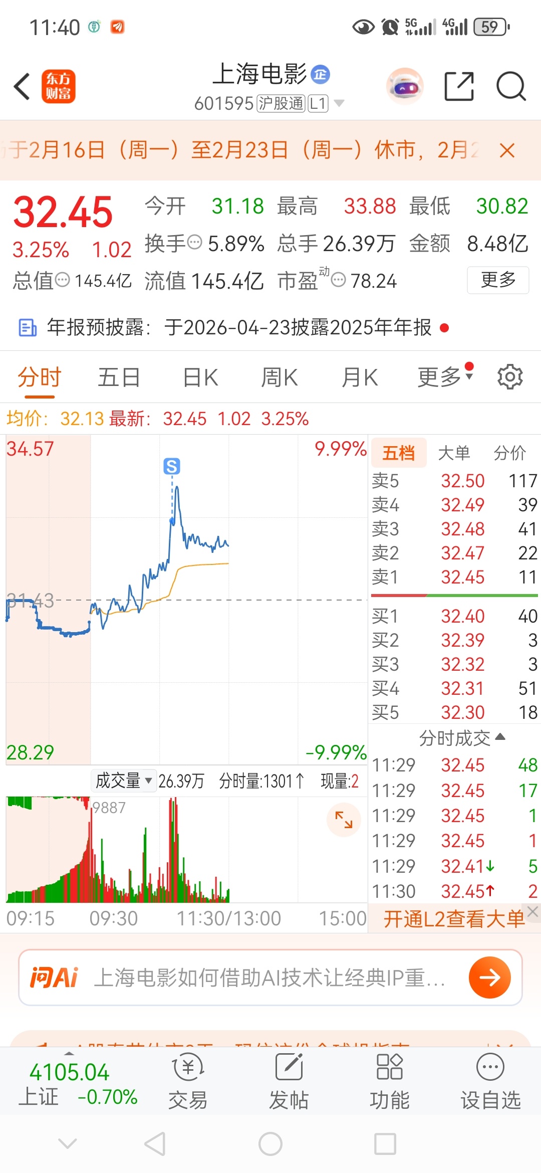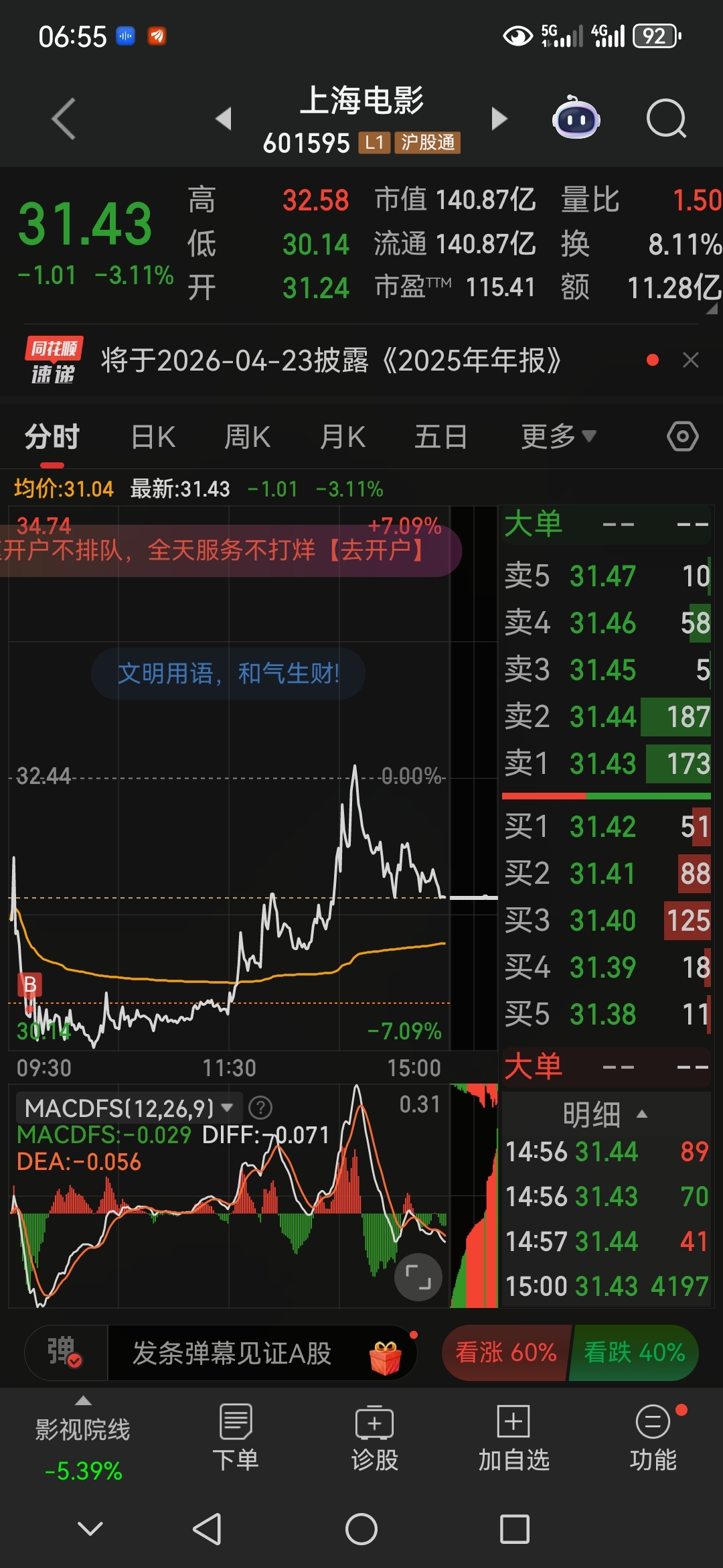 本来有10个点利润了,由于预期过高,结果还回去还倒亏一些套住了。这货名字响亮,但涨起来却很磨叽,昨天减了一点,调仓到跌幅更大,但更积极的上海电影。这货昨天早上有冲的动作,奈何板块情绪冰点,加上节前最后一个出金日,主力干脆顺势趴窝再吸筹一天,今天大概率会有溢价,直接封涨停的可能性不大,因为套牢盘太多了,今日估计是震荡。板块情绪极好的情况下,才有可能涨停。