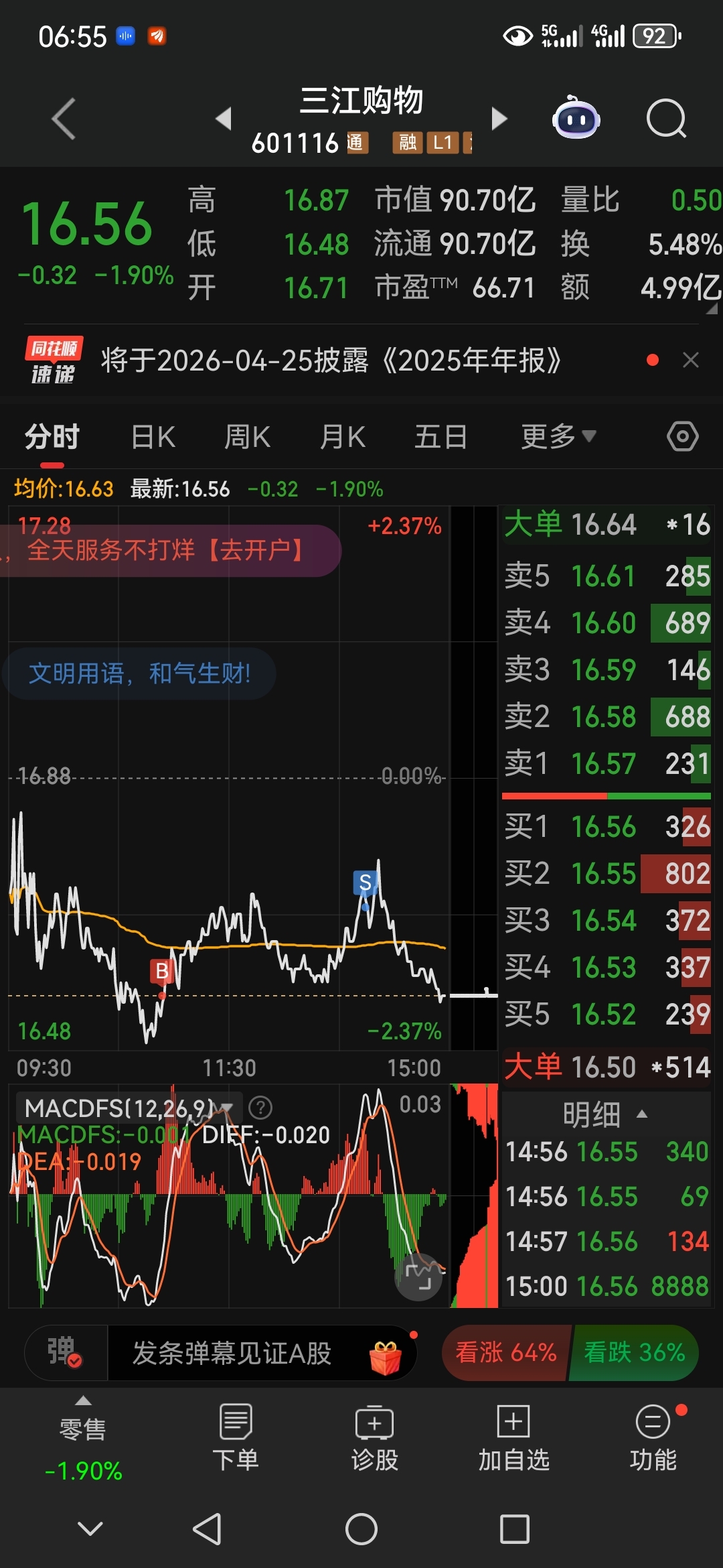 最近消费板块持续低迷,这货昨天又做了一个不到2毛的T,奈何做T还是赶不上跌幅,只能耐心等待机会了。