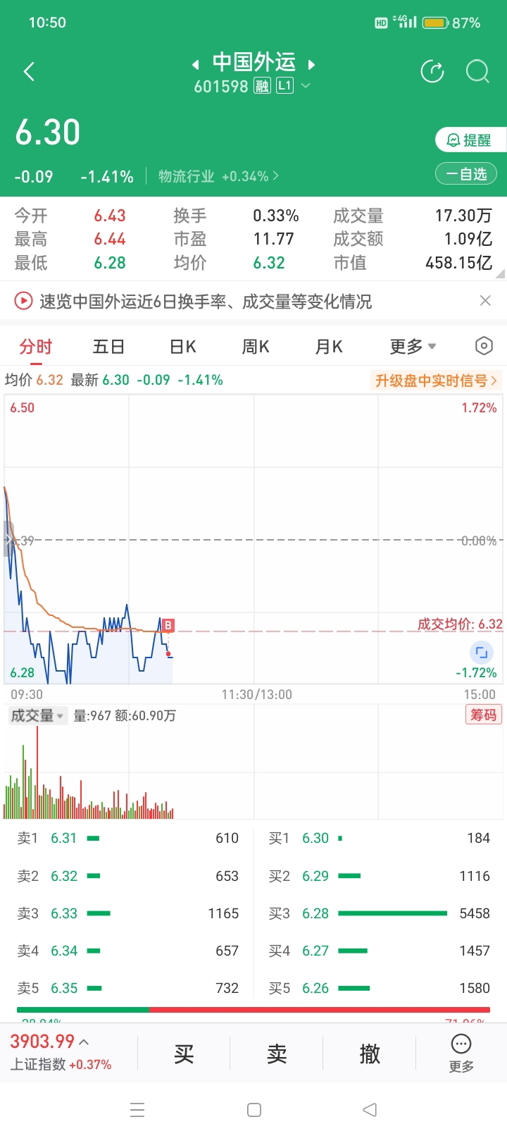$中国外运(SH601598)$ 6.3元买入中国外运。