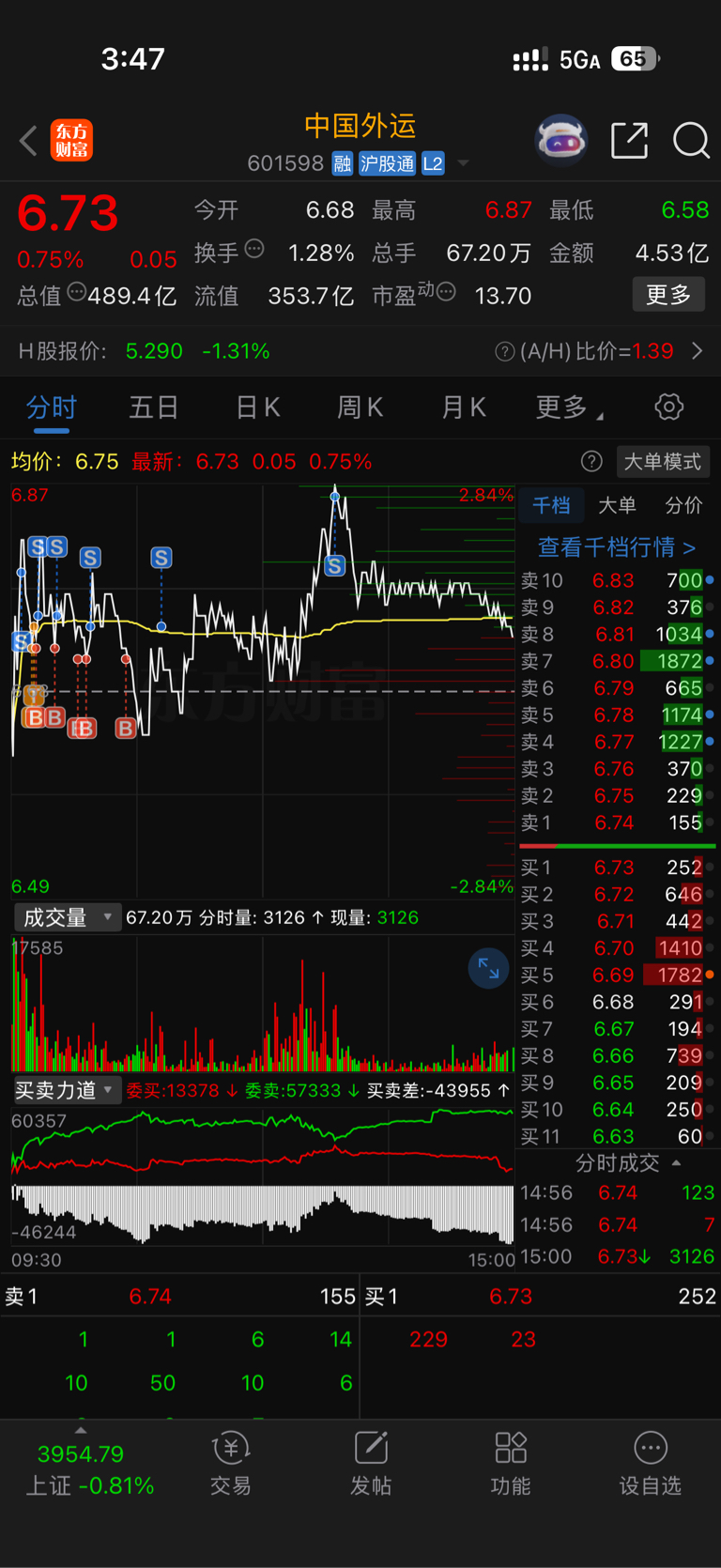 $中国外运(SH601598)$ 这周放量滞涨,这里不确定是不是已经跑完了5浪,a杀即将来临,今天从110%减到7成仓位,额外做了几个t,下周一看情况减仓